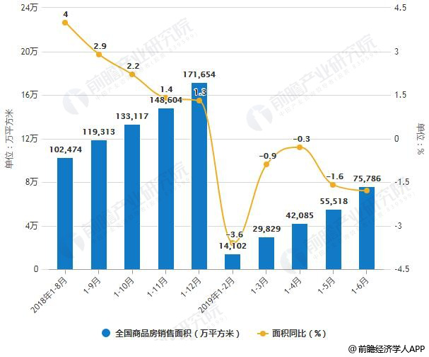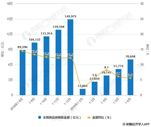 2018-2019年前6月全國(guó)商品房銷售面積、銷售金額統(tǒng)計(jì)及增長(zhǎng)情況